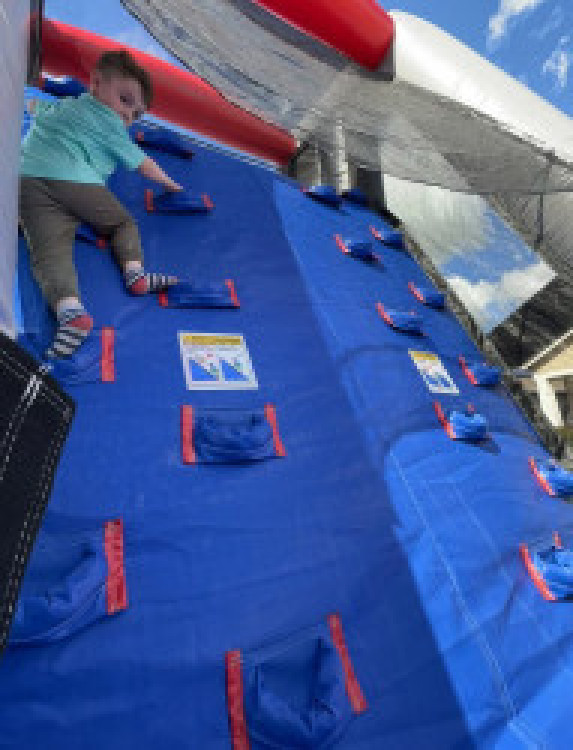 Our Dual Lane Velocity Slide features a one of a kind U-turn slide and rock wall style climbing. This beautiful Velocity Slide brings a sense of speed and adrenaline feeling to any event.