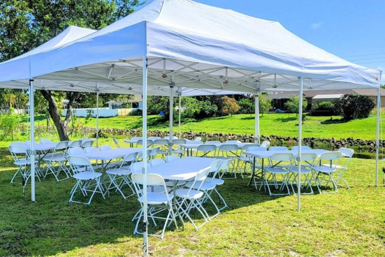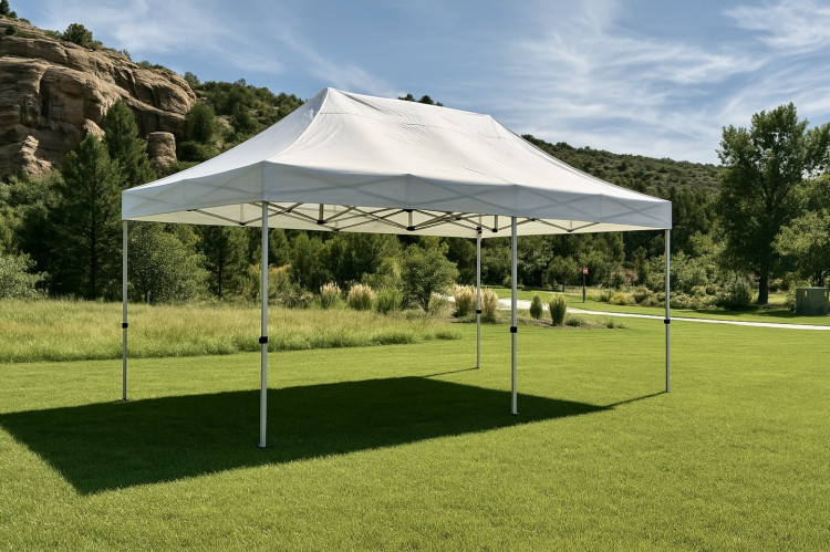 A 10'x20' white pop-up shade provides a clean, roomy shelter perfect for outdoor events. Easy to set up and take down, this portable canopy creates a sun- and light-rain-friendly covered area roughly the size of a small patio—ideal for seating, food service, registration tables, or vendor displays. The crisp white top gives a neutral, professional look that complements any décor or event theme. Lightweight and practical for short-term rental use, it helps keep guests comfortable, protects equipment or supplies from mild weather, and defines a dedicated space at fairs, parties, markets, or backyard gatherings.